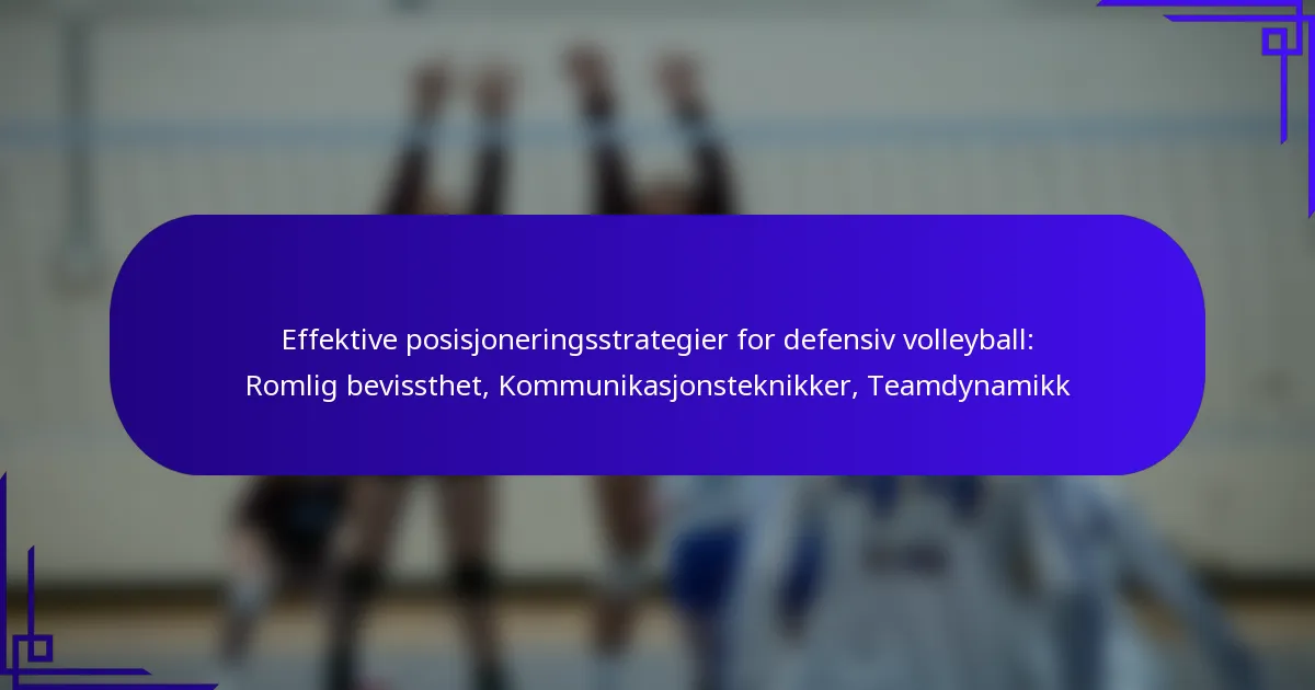 Effektive posisjoneringsstrategier i defensiv volleyball avhenger av romlig bevissthet, kommunikasjonsteknikker og sterke teamdynamikker. Ved å mestre baneplassering og forutsi motstandernes bevegelser, kan spillerne betydelig forbedre sin defensive effektivitet. Klar kommunikasjon blant lagkamerater fremmer koordinasjon og responsivitet, mens en sammenhengende teamdynamikk ytterligere hever den totale ytelsen under kampene.
